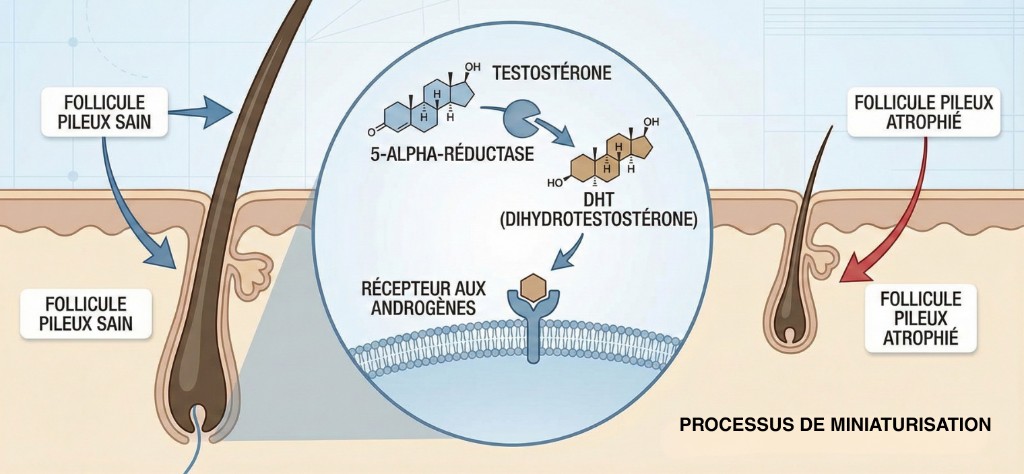 La dihydrotestostérone (DHT) est une hormone dérivée de la testostérone grâce à l'enzyme 5-alpha réductase. Chez les personnes génétiquement prédisposées, la DHT se fixe sur les récepteurs androgéniques des follicules pileux et raccourcit leur phase de croissance (anagène). Le follicule produit alors des cheveux de plus en plus fins, courts et clairs — c'est la miniaturisation — jusqu'à disparaître.