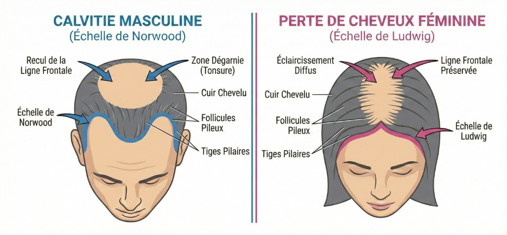 Contrairement à la calvitie masculine qui suit un pattern prévisible (échelle de Norwood), la perte de cheveux féminine est souvent diffuse, progressive et multifactorielle. L'échelle de Ludwig, référence en trichologie féminine, classe l'alopécie en trois stades de sévérité croissante. Le diagnostic différentiel est crucial : une étude de 2023 publiée dans le Journal of Clinical and Aesthetic Dermatology montre que 35 % des femmes diagnostiquées avec une alopécie androgénétique présentaient également une carence en fer non détectée — un facteur aggravant traitable.