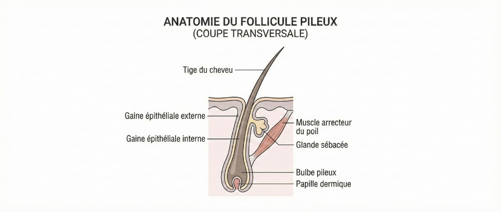 Anatomie & StructureCavité dans le derme qui abrite la racine du cheveu. Chaque follicule contient une papille dermique, une glande sébacée et un muscle arrecteur. Sa santé détermine la qualité de la repousse après greffe.