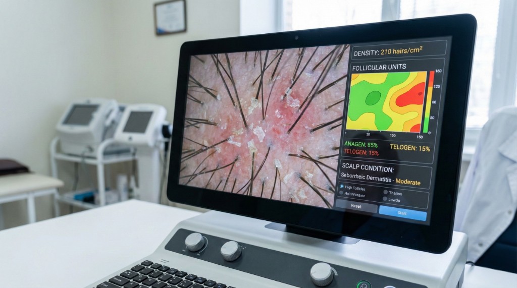 Densité folliculaire (UF/cm²), calibre des cheveux, état du cuir chevelu