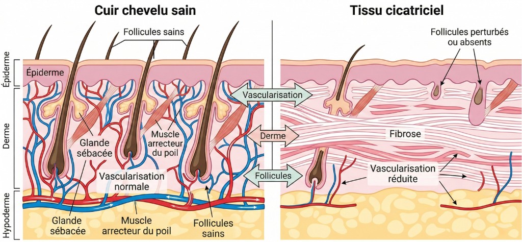 Le tissu cicatriciel est moins irrigué que le cuir chevelu normal. Les greffons reçoivent moins d'oxygène et de nutriments, réduisant le taux de survie.