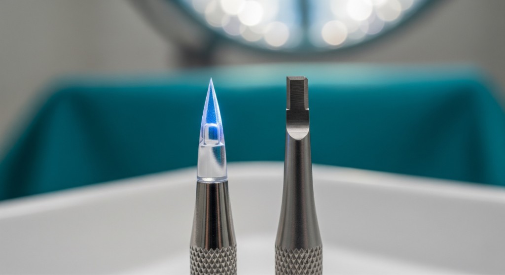 Le saphir synthétique (corindon, Al₂O₃) possède une dureté de 9 sur l'échelle de Mohs (contre 6.5 pour l'acier chirurgical). Cette dureté exceptionnelle garantit que la 5 000ème incision reste aussi nette que la première. La surface cristalline parfaitement lisse à l'échelle nanométrique empêche toute adhérence bactérienne, un avantage décisif pour les interventions de longue durée.