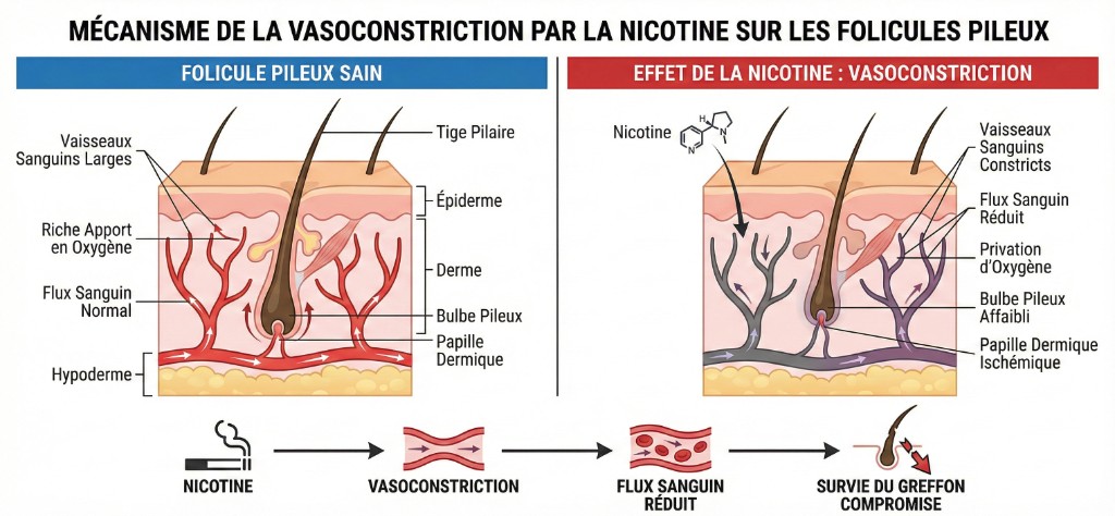 La nicotine réduit le diamètre des vaisseaux sanguins de 30 à 40 %, diminuant l'apport sanguin au cuir chevelu et aux follicules greffés.