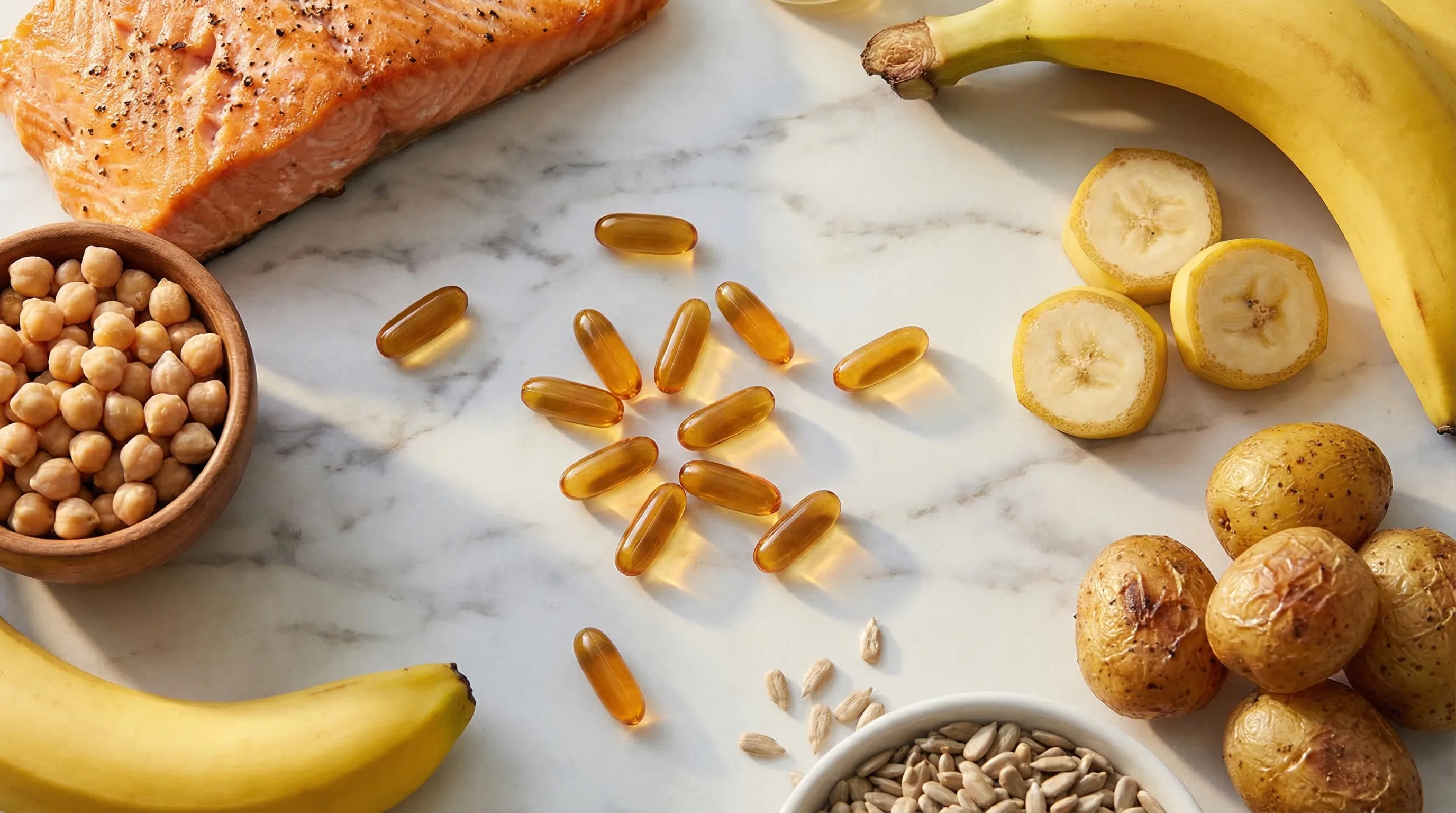 Les meilleures sources alimentaires de vitamine B6 sont : le foie de veau (0,9 mg/100g), le poulet (0,6 mg), le saumon (0,6 mg), les pois chiches (0,5 mg), les bananes (0,4 mg), les pommes de terre (0,3 mg), les graines de tournesol (0,3 mg) et les épinards (0,2 mg). Une alimentation variée couvre généralement les besoins sans supplémentation.