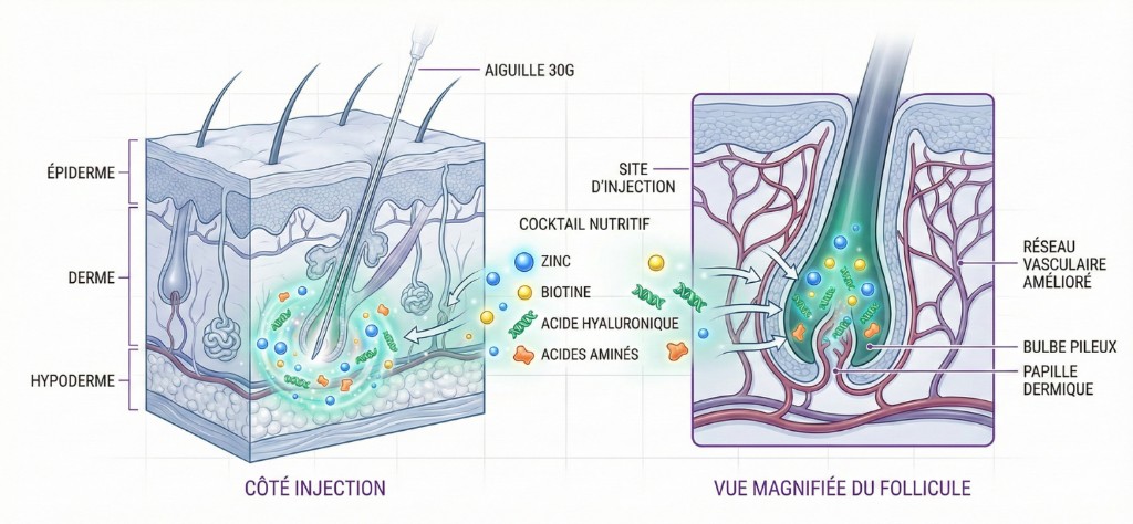 Le cocktail mésothérapeutique utilisé chez Renaissance Clinique est formulé spécifiquement pour l'alopécie. Il contient de la biotine (vitamine B8) qui renforce la kératine, du zinc qui régule la production de sébum et protège le follicule contre la DHT, de la cystéine et de la méthionine — acides aminés soufrés essentiels à la synthèse de la kératine —, et de l'acide hyaluronique non réticulé qui hydrate et nourrit le derme en profondeur.
