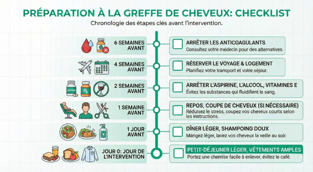 Une bonne préparation optimise les résultats et réduit les risques. 6-4 semaines : arrêter anticoagulants, réserver. 2 semaines : stopper aspirine, Minoxidil, alcool, tabac. 1 semaine : repos, coupe selon consignes. J-1 : shampooing doux, dîner léger. J : vêtements amples, petit-déjeuner léger.