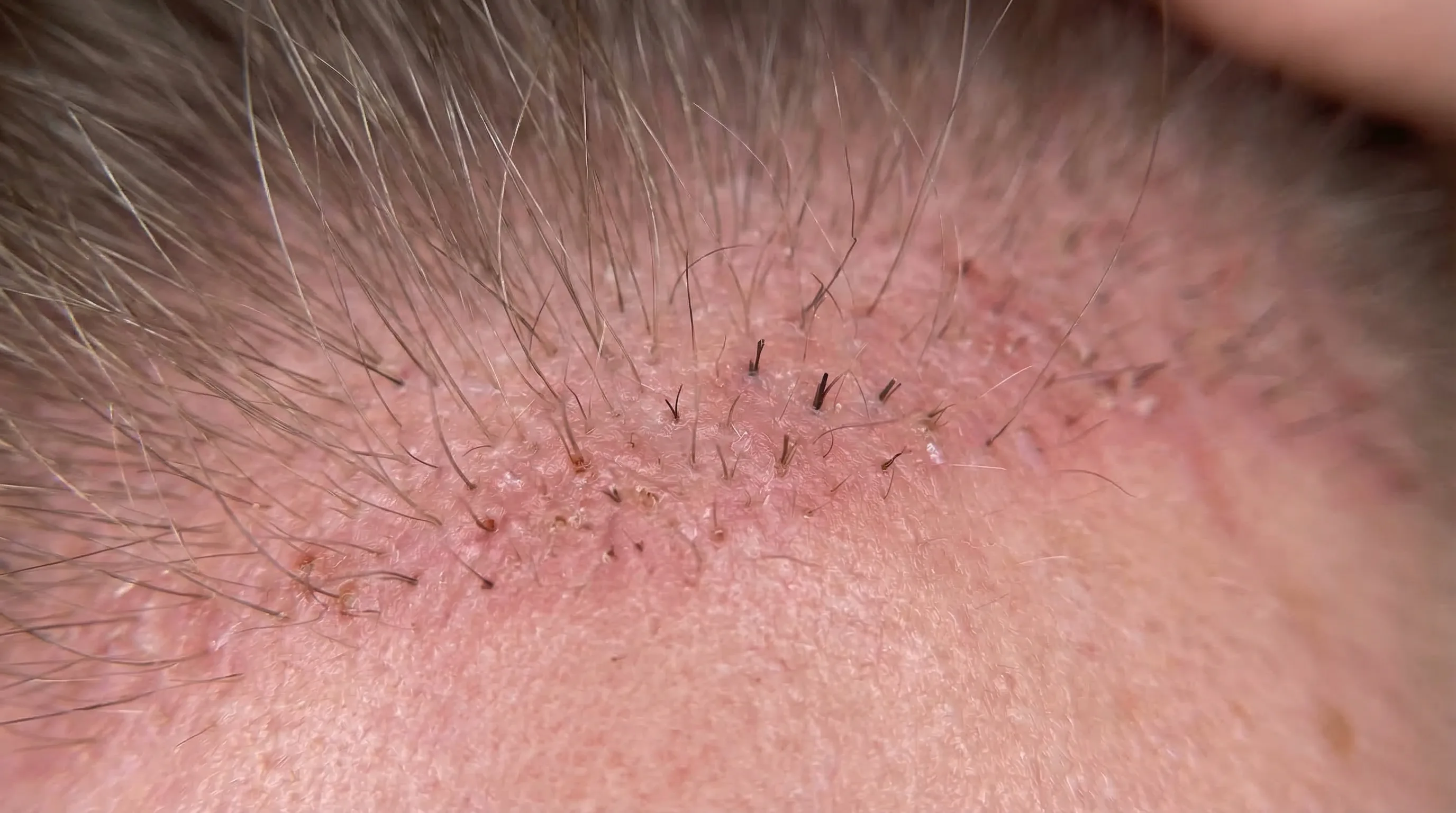 Les greffons sont implantés et les micro-croûtes se forment. Le cuir chevelu est rouge et légèrement gonflé. Les cheveux transplantés sont encore en place. Repos et soins post-opératoires stricts.