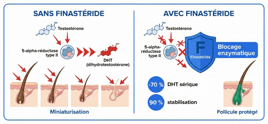 Le principe est simple : la DHT (dihydrotestostérone) est le principal responsable de la miniaturisation des follicules pileux chez les hommes génétiquement prédisposés. Le finastéride bloque la production de DHT en inhibant l'enzyme qui la fabrique. Résultat : les follicules encore viables reprennent un cycle de croissance normal.