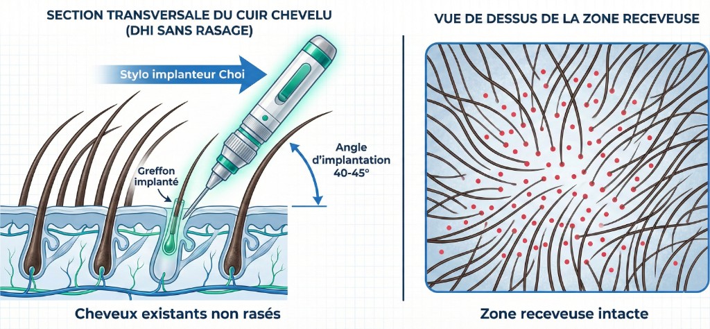 La greffe sans rasage (DHI No-Shave) utilise le stylo Choi pour implanter jusqu'à 3 000 greffons entre les cheveux existants, sans raser la zone receveuse. Taux de survie identique à une greffe classique (>97 %), discrétion totale, retour à la vie sociale en 5-7 jours.