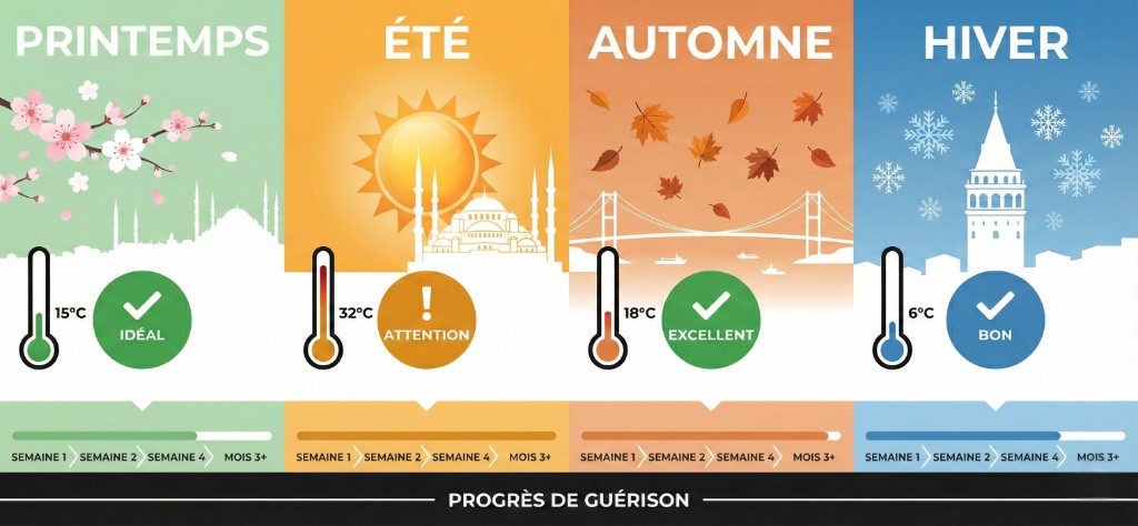 Le printemps (mars-mai) et l'automne (septembre-novembre) sont les périodes les plus recommandées. Les températures modérées à Istanbul (12-22°C au printemps, 15-25°C en automne) favorisent une cicatrisation optimale. L'automne offre un avantage supplémentaire : les résultats commencent à apparaître au printemps suivant, vous êtes prêt pour l'été.