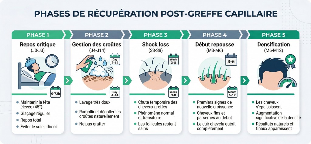 La récupération après une greffe de cheveux suit un calendrier précis en 5 phases distinctes, chacune avec son protocole de soins spécifique. Utilisez la timeline interactive ci-dessous pour explorer chaque phase en détail : ce qu'il faut faire, ce qu'il faut éviter, et ce qui est normal à chaque étape.