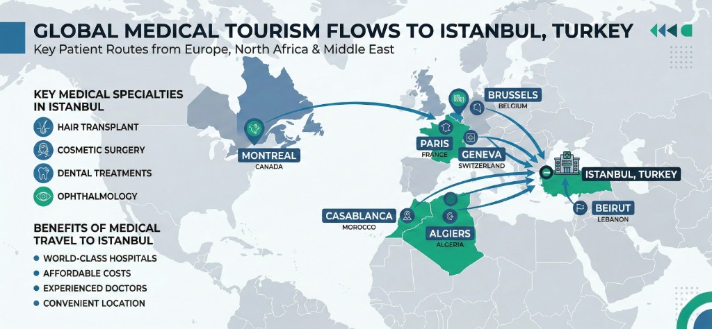 La Tunisie, elle-même destination de tourisme médical, voit de nombreux patients se tourner vers Istanbul. Depuis Tunis, le vol dure environ 3h. Les patients tunisiens bénéficient d'un accès à des technologies et équipements de dernière génération dans les cliniques turques certifiées JCI.